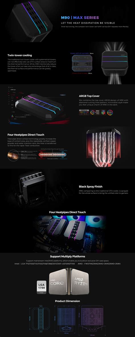 Now, let’s turn our attention to the fan. The included fan is a crucial component, and ALSEYE usually equips the MAX M90 RGB with a high-quality fan that can move a lot of air. PWM (Pulse Width Modulation) control is a standard feature, allowing the fan speed to adjust dynamically based on the CPU’s temperature. This is really awesome because it helps to keep the cooler as quiet as possible when your CPU isn’t under heavy load while ensuring it can ramp up and provide maximum cooling when needed. The RGB lighting is a major visual feature, as we’ve mentioned. Most ALSEYE coolers feature addressable RGB LEDs, allowing for a wide range of colors and lighting effects. The lighting can usually be synchronized with your motherboard’s RGB software, such as ASUS Aura Sync, MSI Mystic Light, or Gigabyte RGB Fusion. This lets you coordinate the cooler’s lighting with the rest of your system, creating a unified and stunning aesthetic. The ALSEYE MAX M90 RGB also typically includes a universal mounting system, making it compatible with a wide range of CPU sockets. This is important because it ensures that the cooler can be used with various CPUs, from older generations to the latest models. The mounting system is usually designed to be easy to install, with clear instructions and all the necessary hardware included. The build quality of the ALSEYE MAX M90 RGB is typically high. The components are made from durable materials, and the overall construction is solid. This ensures that the cooler will last for a long time and perform reliably. The attention to detail is evident in the design and construction of the cooler, from the heatsink fins to the fan blades. The overall design and features of the ALSEYE MAX M90 RGB combine to create a cooler that is both functional and visually appealing. The focus on performance, combined with the integrated RGB lighting and ease of installation, makes it a great choice for gamers and PC enthusiasts. The attention to detail and high-quality construction are key factors that make the ALSEYE MAX M90 RGB a compelling option for anyone looking for an excellent CPU cooler.