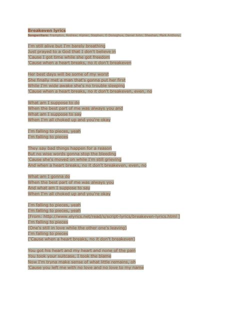 Finally, the outro fades out with “And I’m still alive, but I’m barely breathing.” It brings us right back to that central theme, that feeling of survival against all odds. It’s a lingering thought, a statement that resonates long after the music stops. It’s not a triumphant “I made it!” but a quiet acknowledgment of enduring. For your karaoke performance, let that feeling of quiet endurance be your guide. It’s a powerful way to end. The outro of “Break Even” lyrics often leaves the listener with a profound sense of contemplation. It doesn’t offer a neat resolution but rather reiterates the song’s core theme: survival in the face of overwhelming emotional strain. The repetition of the line “And I’m still alive, but I’m barely breathing” at the end serves as a powerful reminder of the ongoing struggle. It’s not a victory lap; it’s an acknowledgment of resilience, of simply continuing to exist even when it feels incredibly difficult. This understated conclusion is what makes the song so enduring. It mirrors the reality that emotional recovery is often a process, not an event. By ending on this note, the song invites the audience to reflect on their own experiences with hardship and perseverance. For a karaoke performance, this means delivering the final lines with a sense of quiet strength, perhaps a touch of melancholy, but ultimately, a feeling of having weathered the storm. It’s about conveying that sense of enduring, that quiet determination to keep going, which is incredibly moving and relatable. It’s a testament to the human spirit’s capacity to simply be , even when the circumstances are challenging. This quiet power in the outro is what makes “Break Even” such a poignant and memorable song.