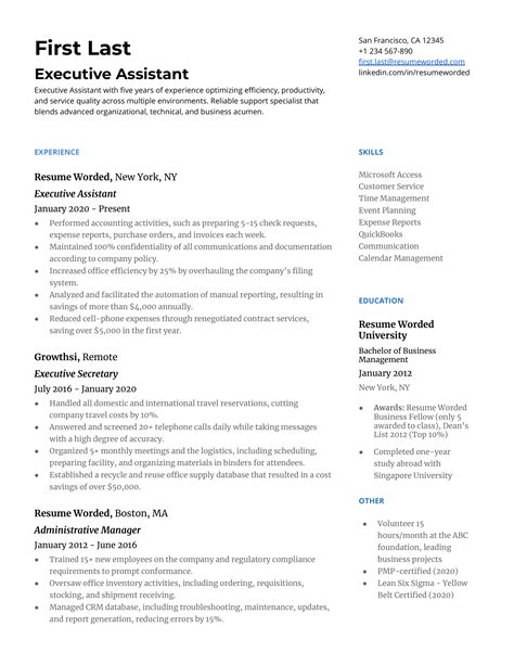 This section is where you showcase your hard and soft skills. Hard skills are technical abilities like proficiency in Microsoft Office Suite, calendar management software, or accounting software. Soft skills are interpersonal skills like communication, organization, problem-solving, and time management. When listing your skills, be specific and provide examples of how you’ve used them in previous roles. For example, instead of just saying “Communication,” try “Excellent written and verbal communication skills, demonstrated through preparing executive-level presentations and drafting internal memos.” Tailor your skills list to the specific job description, highlighting the skills that are most important to the employer. Consider using a combination of bullet points and skill categories to make this section easy to read and scan. Don’t exaggerate your skills – be honest about your proficiency level. If you’re not an expert in a particular skill, it’s better to omit it than to overstate your abilities. Remember, your skills section is a quick snapshot of your qualifications, so make it concise, relevant, and accurate.