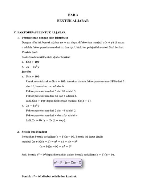 Jadi guys, setelah kita melalui serangkaian langkah yang asyik tadi, kita sudah sampai pada jawaban akhir untuk pertanyaan “bentuk faktor dari 3ab + 12bc adalah” . Dengan meneliti koefisien (angka) dan variabel di setiap suku, kita menemukan bahwa Faktor Persekutuan Terbesar (FPB) dari 3ab dan 12bc adalah 3b . FPB inilah yang kemudian kita ‘keluarkan’ atau pisahkan dari kedua suku tersebut. Caranya adalah dengan membagi setiap suku dengan FPB-nya. Hasil pembagian suku pertama ( 3ab dibagi 3b ) adalah a . Hasil pembagian suku kedua ( 12bc dibagi 3b ) adalah 4c . Akhirnya, kita susun kembali menjadi bentuk perkalian: FPB dikali dengan jumlah hasil pembagiannya. Maka, bentuk faktor dari 3ab + 12bc adalah 3b(a + 4c) . Mudah, kan?