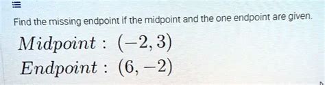1. Confusing Midpoint and Endpoint Coordinates: This is probably the most frequent error. You’ll be given \((x_m, y_m)\) and \((x_1, y_1)\) and accidentally swap them when plugging into the formula \(x_2 = 2x_m - x_1\) or \(y_2 = 2y_m - y_1\) . Solution: Always, always, always label your knowns clearly at the start! Write down: Midpoint X = __, Midpoint Y = __, Endpoint 1 X = __, Endpoint 1 Y = __. This visual separation makes it much harder to mix them up.