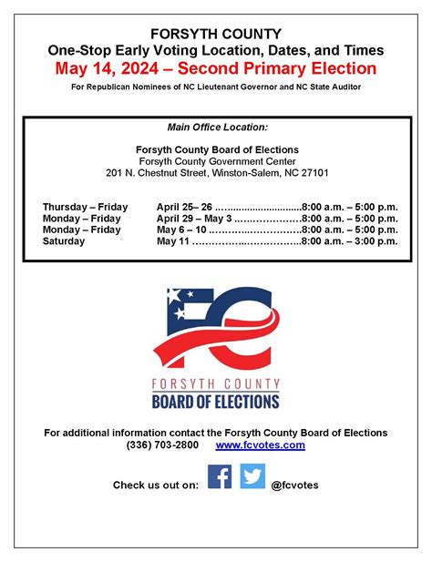 To find out the exact dates and times for early voting in Forsyth County, the best resource is the Forsyth County Elections Office. Their website is regularly updated with the most current information regarding election schedules, including the start and end dates for early voting, as well as the hours of operation for each early voting location. You can also find this information by contacting the Elections Office directly via phone or email. Staying informed about these dates is essential for planning your visit to the polls and ensuring you don’t miss the opportunity to vote early.