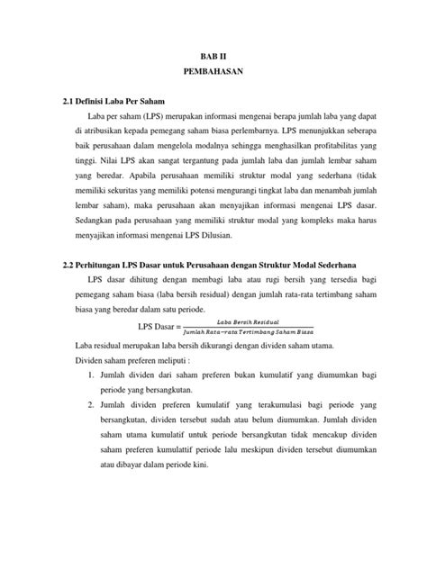 Oke, guys, mari kita bedah cara ngitung laba per saham dasar alias basic earnings per share (BEPS) . Ini adalah perhitungan yang paling fundamental, ibarat kata pondasi rumah. Rumusnya simpel banget: BEPS = (Laba Bersih yang Dapat Didistribusikan kepada Pemegang Saham Biasa) / (Jumlah Rata-rata Tertimbang Saham Biasa yang Beredar) . Kedengeran gampang, kan? Tapi ada beberapa hal penting yang perlu dicatat. Pertama, soal laba bersih yang dapat didistribusikan . Ini tuh laba bersih perusahaan setelah dikurangi segala macam pengeluaran yang bukan hak pemegang saham biasa. Misalnya, ada dividen saham preferen, nah itu harus dikurangi dulu dari laba bersih. Kenapa? Karena pemegang saham preferen punya hak duluan lho atas pembagian laba. Jadi, yang tersisa baru deh buat pemegang saham biasa. Penting banget nih biar gak salah alokasi keuntungan. Terus yang kedua, soal jumlah rata-rata tertimbang saham biasa yang beredar . Kenapa harus rata-rata tertimbang? Soalnya jumlah saham yang beredar itu bisa berubah-ubah sepanjang tahun. Bisa jadi perusahaan menerbitkan saham baru, atau malah melakukan buyback saham. Nah, kalau kita cuma pake jumlah saham di akhir periode, itu gak adil. Rata-rata tertimbang ini memastikan kita ngitungnya proporsional berdasarkan berapa lama saham itu beredar. Misalnya, kalau ada saham baru diterbitkan di pertengahan tahun, ya hitungannya cuma setengah tahun aja. Ini penting banget biar EPS-nya representatif terhadap kinerja perusahaan selama setahun penuh. IPSAS 72 ngasih panduan detail banget soal cara ngitung rata-rata tertimbang ini, termasuk penyesuaian kalau ada penerbitan saham baru dengan harga diskon atau bonus share. Jadi, intinya, BEPS itu ngasih gambaran keuntungan murni per lembar saham biasa tanpa embel-embel potensi perubahan di masa depan. Ini adalah tolok ukur awal yang paling basic dan penting buat semua investor. Pastikan perhitungannya akurat ya, guys, biar gak menyesatkan!