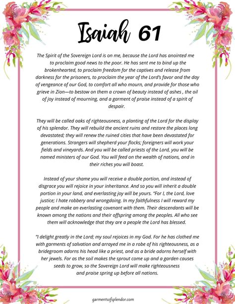 To truly grasp Isaiah 61:13 , we’ve got to zoom out and look at the surrounding verses, right? The power of this promise is amplified when you see it nestled within the larger prophetic message of restoration and redemption in Isaiah chapter 61. Before verse 13, Isaiah is detailing the Lord’s Anointed’s mission: to proclaim good news to the afflicted, bind up the brokenhearted, comfort those who mourn, and grant a crown of beauty instead of ashes. We’re talking about a radical transformation, a spiritual and social renewal. He promises to rebuild ancient ruins, raise up former desolations, and restore desolate cities. This sets the stage perfectly for the assurance in verse 13. It’s like saying, “After all this rebuilding and healing, here’s what the result looks like.” The verse is a direct consequence and a tangible outcome of God’s restorative work. It’s not just about individual salvation; it’s about the flourishing of the community and the continuity of blessing.