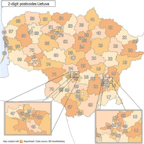 . Lithuania is divided into various postal districts, and the first two digits of the postal code will tell the system which of these major regions the mail belongs to. For instance, codes starting with