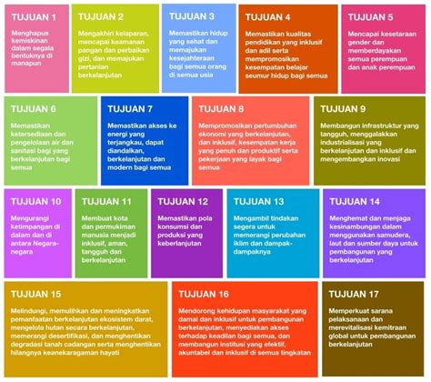 17. Kemitraan untuk Mencapai Tujuan:** Memperkuat sarana pelaksanaan dan merevitalisasi kemitraan global untuk pembangunan berkelanjutan. Ini termasuk meningkatkan kerjasama internasional, memberikan dukungan keuangan dan teknologi, serta membangun kemitraan antara pemerintah, sektor swasta, dan masyarakat sipil.