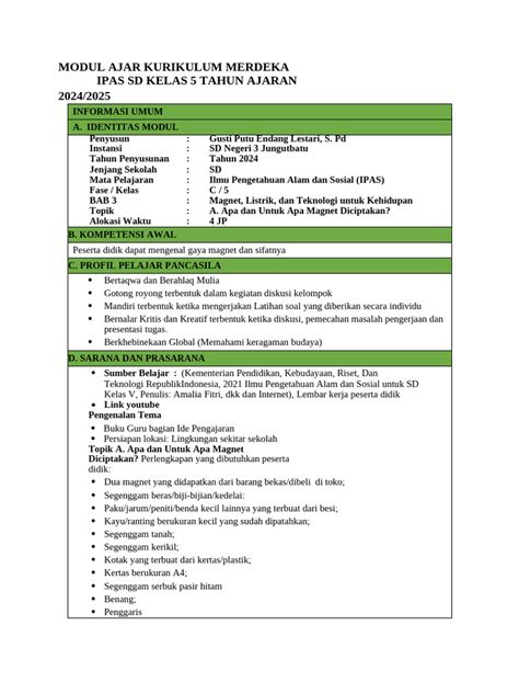 Yuk, guys, sekarang kita bedah lebih dalam lagi apa aja sih yang biasanya ada di dalam Modul Ajar Kurikulum Merdeka IPAS SD kelas 5 yang keren itu. Memang sih formatnya bisa bervariasi tergantung sekolah dan guru, tapi ada beberapa komponen inti yang wajib banget ada biar modulnya efektif dan sesuai dengan semangat Kurikulum Merdeka. Mari kita lihat satu per satu, ya! Pertama , ada Informasi Umum . Bagian ini ibarat kartu identitas modul. Isinya mencakup nama penyusun (guru), institusi (sekolah), mata pelajaran (IPAS), kelas/semester, alokasi waktu per pertemuan, dan tentu saja tahun penyusunan. Kadang juga ditambahkan kompetensi awal siswa yang sudah dipetakan guru sebelum materi ini diajarkan. Ini penting biar guru punya gambaran utuh tentang konteks pembelajaran.