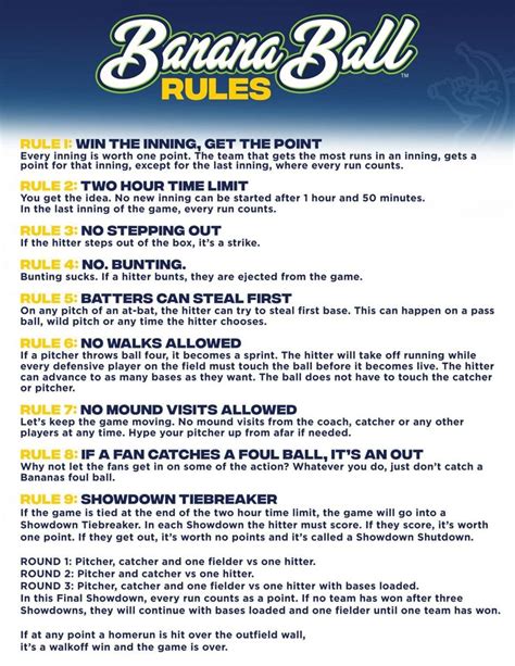 So, what exactly is Banana Ball? Think of it as baseball’s quirky cousin who loves to shake things up. The core idea of Banana Ball is to make the game more accessible, faster-paced, and frankly, more entertaining for everyone involved. It’s not about strict adherence to every single traditional baseball rule; it’s about keeping the energy high and the fun factor through the roof. This means some rules are simplified, some are tweaked, and some are just plain different. The goal is to keep the game moving, reduce downtime, and encourage more action on the field. Whether you’re a seasoned pro or just playing for laughs in the park, Banana Ball aims to deliver an awesome experience. We’re talking about a sport that embraces silliness while still having a competitive edge. It’s perfect for casual get-togethers, team-building events, or just a Saturday afternoon with friends. The spirit of Banana Ball is all about participation and enjoyment, making sure everyone gets a chance to shine and have a blast. We want to ensure that the game isn’t just for the super-athletes but for anyone who wants to pick up a bat and have a go. The dynamic nature of Banana Ball also means that strategies can be fluid, and quick thinking is often rewarded. It’s a game that encourages creativity and a willingness to adapt, which is part of its charm. So, when we talk about the official rules, remember that the overarching principle is fun and engagement, designed to create memorable moments on the diamond.