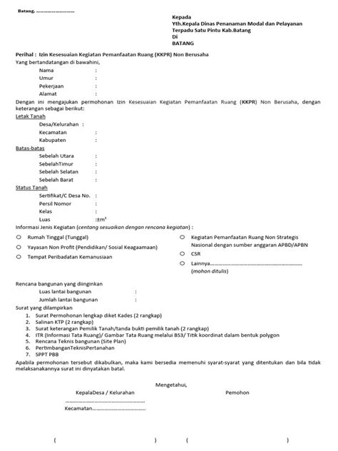 Perlu diingat juga, proses pengajuan KKPR ini terintegrasi dengan sistem perizinan berusaha . Artinya, KKPR ini jadi salah satu syarat utama sebelum kalian bisa dapetin Nomor Induk Berusaha (NIB) dan izin-izin lain yang diperlukan. Tanpa KKPR, proses perizinan kalian bakal mentok di tengah jalan. Jadi, pastikan kalian urus ini duluan ya, biar gak buang-buang waktu dan tenaga.