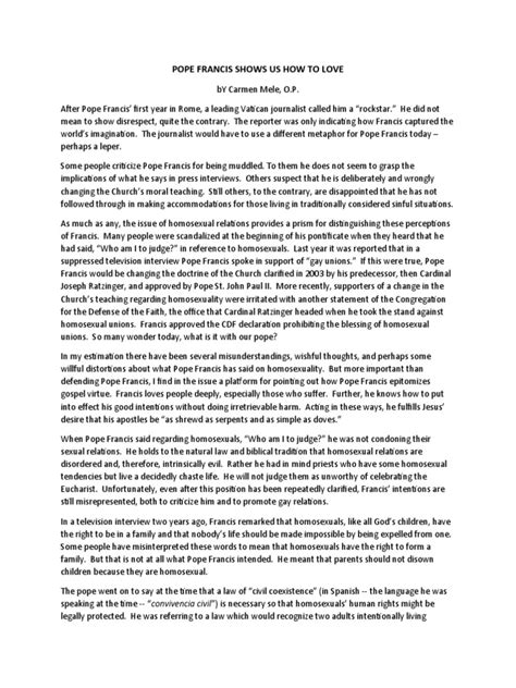 When discussing Pope Francis on marriage, the topic of same-sex unions inevitably comes up. His stance is nuanced and often sparks debate. While he maintains the Catholic Church’s traditional teaching that marriage is between a man and a woman, he has also expressed openness to civil unions for same-sex couples. This position reflects a desire to balance traditional doctrine with a pastoral approach that seeks to recognize the rights and dignity of all people. The Church’s official teaching, as reiterated by Pope Francis, is that marriage is a sacrament instituted by God and is inherently ordered toward the procreation and education of children. This understanding is based on the belief that God created man and woman to complement each other and to form a natural family unit. Therefore, the Church does not recognize same-sex unions as marriage in the sacramental sense. However, Pope Francis has also stated that same-sex couples should be afforded legal protections and rights. He has expressed support for civil unions, which provide legal recognition and protection for same-sex couples without equating them to sacramental marriage. This position is rooted in the belief that all people are created in God’s image and deserve to be treated with dignity and respect. It also reflects a recognition that same-sex couples often face legal and social challenges, such as inheritance rights, healthcare benefits, and the ability to make decisions for their partners in times of crisis. While his openness to civil unions has been welcomed by some as a sign of progress and inclusion, it has also drawn criticism from those who believe it undermines the traditional definition of marriage. However, Pope Francis’s position reflects a desire to find a way to balance traditional doctrine with a pastoral concern for the well-being of all people.