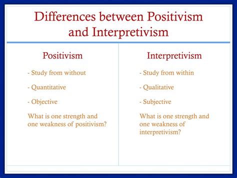 So, what are the main distinctions that set positivism and post-positivism apart? Let’s break it down, guys. The biggest divergence lies in their stance on objectivity and certainty . Positivism operates under the assumption that objective reality is fully knowable and that researchers can be completely detached, unbiased observers. They aim for absolute truth. Post-positivism, on the other hand, argues that while objective reality exists, it’s only imperfectly knowable . Researchers can strive for objectivity and minimize bias, but they can never fully eliminate their subjective influence. It’s more about getting closer to the truth than claiming to have found it definitively. Another crucial difference is their view on knowledge acquisition . Positivists believe knowledge is built through direct observation and measurement, leading to universal laws. Post-positivists, while valuing empirical evidence, are more cautious. They understand that our observations are theory-laden and that multiple perspectives can offer different, yet valid, insights. They focus on probabilistic knowledge – what is likely true based on the evidence available, rather than what is absolutely true. Think about methodology , too. While both often use quantitative methods, positivists tend to favor experimental designs to establish cause-and-effect relationships directly. Post-positivists might also use experiments but are more likely to employ quasi-experimental designs or even mixed methods, incorporating qualitative data to provide a more comprehensive understanding. They’re also more concerned with falsification – actively trying to disprove hypotheses – as a way to strengthen their theories. Positivism is more about confirming hypotheses. Finally, consider their view on values . Positivists aim to keep values completely out of the research process. Post-positivists acknowledge that values can influence research, but they emphasize the importance of transparency and reflexivity, encouraging researchers to be aware of and account for their own values. It’s a more humble and realistic approach to understanding the world, recognizing the inherent complexities and limitations of human inquiry. These aren’t just semantic quibbles; these philosophical underpinnings deeply shape how research is conducted and interpreted, guys.