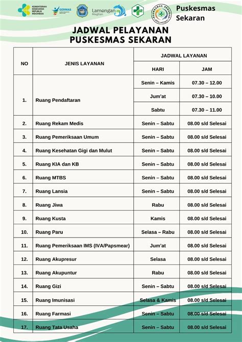 • Visit the Puskesmas in Person: If you’re near the Puskesmas, drop by and look for a notice board or information desk. Operating hours are usually posted there. You can also ask the staff directly for a printed schedule or information.