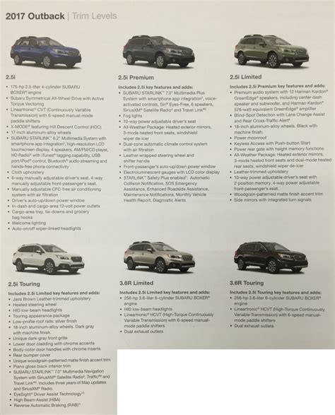 Stepping inside the Subaru Outback 2017 , you’ll find an interior that prioritizes comfort, practicality, and user-friendly technology. Subaru has always focused on creating cabins that are functional and durable, and the 2017 Outback definitely delivers. The materials used feel solid and built to last, which is exactly what you want in a vehicle designed for adventure. Seats are comfortable, offering good support for longer drives, and the overall layout is intuitive. The cabin is surprisingly spacious, especially for rear passengers, offering ample legroom and headroom. This makes it a great choice for families or if you often have friends along for the ride. Cargo space is another area where the Outback shines. With the rear seats up, you have a generous amount of room for groceries, luggage, or gear. Fold them down, and you unlock a cavernous space that can handle bigger items, making trips to the home improvement store or packing for a camping trip a breeze. It’s one of the most practical cargo areas in its class, guys. Now, let’s talk tech. The 2017 Outback came with Subaru’s STARLINK infotainment system, which was a pretty decent setup for its time. Higher trims offered a larger touchscreen display (up to 7 inches) that housed controls for audio, navigation (if equipped), and smartphone integration features. While it might not have the flashiest graphics compared to today’s systems, it was generally easy to use and reliable. Bluetooth connectivity for hands-free calling and audio streaming was standard or available on most trims, which is a must-have these days. USB ports and an auxiliary input jack meant you could keep your devices charged and connected. For audiophiles, an upgraded Harman Kardon audio system was available on some trims, delivering crisp and powerful sound. Beyond the infotainment, Subaru also focused on practical touches like ample storage cubbies, well-placed cupholders, and an available power liftgate for easier cargo access – a real convenience when your hands are full. The overall ambiance of the interior is one of quiet competence. It’s not trying to be a luxury car, but it offers a refined and comfortable experience that makes every drive, whether it’s a daily commute or a weekend road trip, an enjoyable one. The focus here is on delivering a user-friendly and practical environment that complements the vehicle’s adventurous spirit.