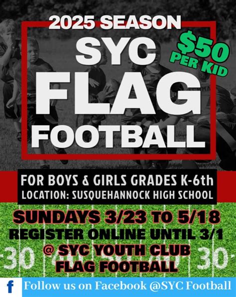 SYC Flag Football is an amazing opportunity for kids and teens to get active, learn valuable skills, and make lasting friendships. It’s a well-organized program that emphasizes safety, sportsmanship, and community involvement. Whether your child is a seasoned athlete or a complete beginner, they’ll find a welcoming and supportive environment in SYC Flag Football . So, what are you waiting for? Sign up today and let the fun begin! By participating in this program, your child will not only develop their athletic abilities but also learn important life lessons that will benefit them both on and off the field. The memories and friendships they make will last a lifetime. Get involved, support your child, and enjoy the journey!