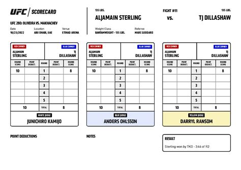 Let’s revisit the bantamweight title fight between Aljamain Sterling and T.J. Dillashaw. While the fight ended by TKO due to injury, looking at the action leading up to that stoppage gives us insight into how the UFC 280 official scorecards would have likely played out had it gone the distance. Sterling was implementing his game plan effectively, utilizing his speed and grappling to keep Dillashaw on the back foot. He was landing combinations and controlling the center of the octagon. Dillashaw, despite his experience, seemed hesitant, perhaps impacted by his previous shoulder injury flaring up. The first round was competitive, but Sterling’s output and control were arguably slightly superior. The second round saw Sterling come out with even more confidence, landing effectively and pressuring Dillashaw. The injury, unfortunately, put a definitive end to the contest. The UFC 280 official scorecards , had they been needed, would have likely shown Sterling ahead, perhaps 10-9 or even 20-18, based on his visible dominance in the exchanges and control time. It underscores Sterling’s growth as a champion and his ability to handle veteran talent. The TKO stoppage prevented a full scorecard breakdown, but the visual cues strongly supported Sterling’s command of the fight before the unfortunate injury.