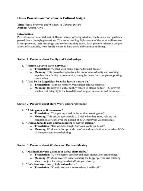 In conclusion, Hausa proverbs are much more than just a collection of old sayings. They represent a living cultural tradition, a source of wisdom, and a reflection of the Hausa people’s rich heritage. From their concise structure and insightful meanings to their versatile usage and enduring relevance, these proverbs offer a unique window into the Hausa worldview. They’re a testament to the power of language and the importance of cultural preservation. So, the next time you hear a Hausa proverb, take a moment to appreciate the depth of meaning, the historical context, and the cultural richness that it embodies. They are important to the people and society.