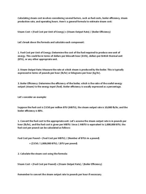 1. Determine the Price of Steam: This is the total cost of producing steam over a specific period, such as a month or a year. Gather all the relevant costs, which includes fuel expenses, labor costs, water treatment costs, and any other expenses directly related to steam production. You’ll need to sum all these costs.