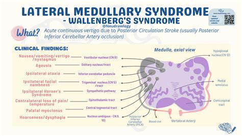 To really grasp Wallenberg Syndrome, we need to talk a little bit about the medulla oblongata . Think of it as the lowest part of your brainstem, connecting the rest of your brain to your spinal cord. It’s not huge, but it packs a serious punch in terms of function. It’s responsible for some of our most basic, life-sustaining functions – like regulating your breathing, your heart rate, and your blood pressure. Seriously, guys, without this little guy working, we wouldn’t be here! But it doesn’t stop there. The medulla also plays a role in swallowing, vomiting, and coughing. It houses nuclei for several cranial nerves (those that connect directly to the brain, bypassing the spinal cord), which are involved in functions like taste, hearing, and head and neck movements. The lateral part of the medulla, specifically, is where the PICA (posterior inferior cerebellar artery) or vertebral artery usually supplies blood. When this artery gets blocked or bursts, that’s when Wallenberg Syndrome can occur. The PICA is like the lifeline for this specific region, and any interruption to that flow can have devastating consequences. It’s amazing how such a compact area of the brain controls so much. The complex network of neurons and pathways within the medulla allows for the intricate regulation of autonomic functions that keep us alive and kicking. Damage here can disrupt these critical processes, leading to the diverse array of symptoms associated with Wallenberg Syndrome. The precise location of the stroke within the lateral medulla determines the specific set of symptoms experienced, highlighting the intricate and localized nature of brain function.